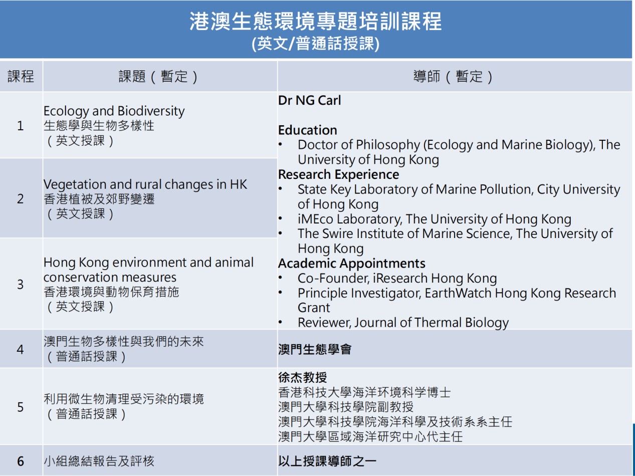 为在新时代新国际环境背景下进一步拓宽国际交流渠道,全面提升员工国际化视野,培养具有全球胜任力和国际竞争力的高素质人才。公司拟联合香港大学继续教育公司、澳门大学持续进修中心开展“生态系统与环境科学主题“”访学项目。授课教师均来自澳门大学、香港大学资深教授,这些教师主要毕业于哈佛大学、加州理工公司、剑桥大学、爱丁堡大学、北京大学等世界一流大学。项目详细介绍见附件一,现将报名信息通知如下:
