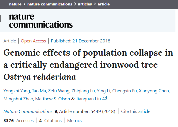 多数树种是异交的,因而理论预测濒危树种由于近交抑制(自交或近交导致不产生后代或后代生存力快速降低)会快速灭亡。上世纪九十年代科学家预测濒危树种及其它濒危植物会在2015年前大规模灭绝和消失。但Science 2016年发文指出,二十年后的实际监测发现只有少数物种灭绝,其中的原因不清楚。刘建全教授课题组选择铁木属的两个近缘种进行研究。一个濒危种只有五棵野生植株,局限分布在天目山;另一个种广布于西南山地和东部地区。他们通过全基因组水平的群体遗传学和野外调查研究发现:两个物种有效群体大小均在第四纪冰期开始下降;但广布种在冰期结束后有效群体大小迅速回升,而濒危种有效群体大小在冰期结束后的全新世以来继续下降;濒危种基因组上的有害突变总体上增加,且自然结实有不育发生;但仍然存在正常结实。令人惊讶的是濒危种中极端有害突变比广布种明显减少了。因此,长时间特续的有效群体大小下降导致近交抑制减弱,加上极端有害突变减少,使该频危树种还能结实,垂而不死,继续生存。tyc5997太阳集团刘建教授全课题组自聘工作人员杨勇志博士和马涛教授为并列第一作者,刘建全教授为通讯联系人,兰州大学、华东师大、浙大、天目山自然管理局和美国德克萨斯理工公司的相关研究人员参与了该工作。
