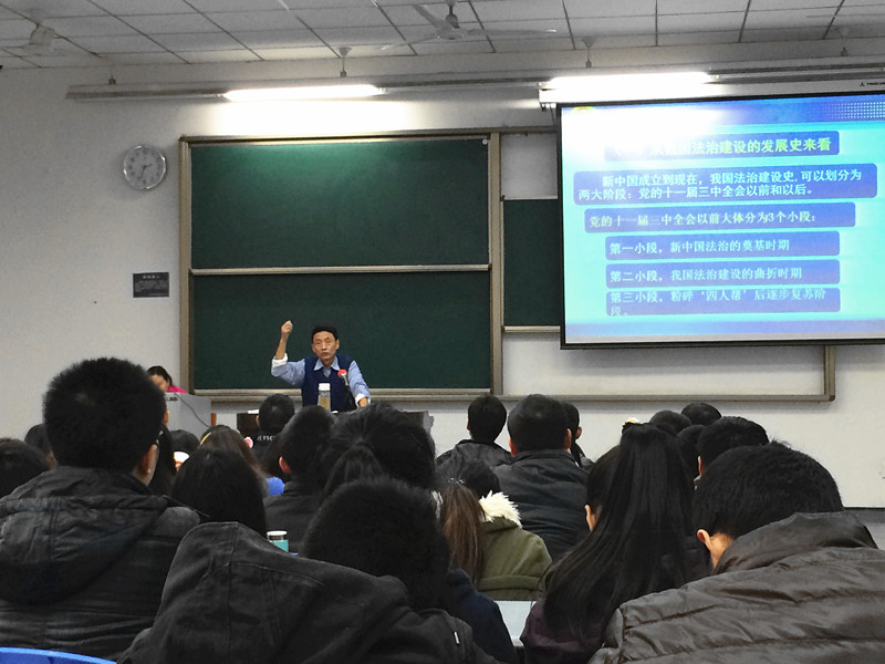 张诚教授围绕党的十八届四中全会的主要精神,从全会《决定》的“重大意义、若干重点、学习贯彻”三个方面,系统地进行了宣讲。张教授首先从新中国至今的法治建设史和全会《决定》开创性的主要标志两个方面,强调了四中全会及其《决定》重大而深远的意义;接着,对全面推进依法治国的方向、指导思想、基本原则、总目标、总布局、总抓手、路线图,基本任务以及党与法的关系等一系列重大问题,进行了生动活泼地解读;最后,张教授联系实际,从“深入学习宣传、加快依法治校步伐、扎实落实全会部署、提升干部法治能力、增强师生守法依法用法意识”等五方面,提出了深入学习贯彻全会精神的思考建议。