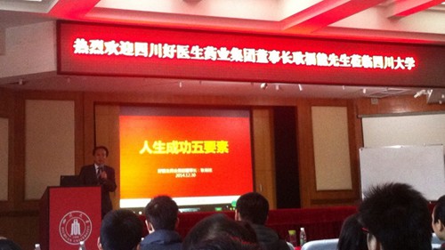 2014年12月30日下午两点半,四川好医生药业集团公司董事长耿福能先生个人分享会暨四川好医生药业集团校园招聘会在tyc5997太阳集团商公司205报告厅举行。tyc5997太阳集团部分领导、教师、辅导员及广大同学近200人参加了此次分享会,分享会由公司党委书记岳碧松教授主持。