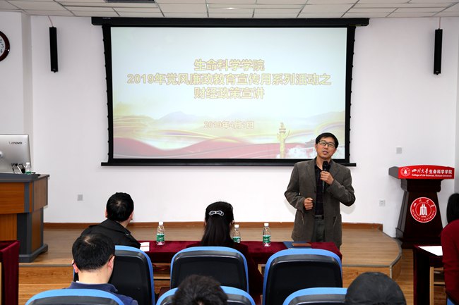 2019年4月1日下午,2019年党风廉政教育宣传月系列活动之财经政策专题学习宣讲会在学术报告厅举行。宣讲会由校财务处处长王宝富教授主讲,公司党委书记林宏辉教授主持。公司领导班子成员、各课题组财经负责人和党员教师参与了此学习会。。