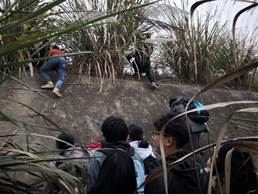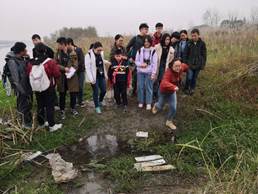 11月23日中午12时许的鸭子河河岸附近,冬风萧瑟,芦苇摇曳,河缓平流,大家沿河畔向上游前进。在滩涂密布的高草中前行路途中,偶遇了拦路的小溪流,同学们纷纷拿出体测跳远测试的劲头跳过河面,大多数同学们在半空中划出一个优美的弧线抵达对岸。但也有个别同学马失前蹄,落入了水里,最终在大家齐心协力的帮助下所有人都通过了考验。