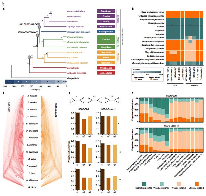 利用多个数据集和多种方法的构树分析表明,无油樟和睡莲类依次是其他被子植物的姐妹群,同时推测金鱼藻是真双子叶植物的姐妹群。他们的研究还发现,除杂交外,不完全谱系筛选可能是早期被子植物辐射分化过程中,引起主要分支之间基因树、或核基因组-叶绿体基因组系统发育树分支关系不一致的主要原因(图2)。