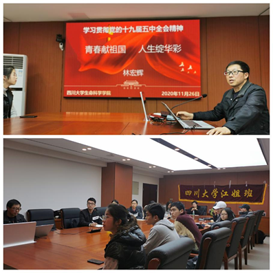 2020年11月26日晚7:30,四川老员工命科学公司党委书记林宏辉围绕“学习贯彻党的十九届五中全会精神”给“江姐班”全体同学讲授了一次别开生面的党课。在本次党课上,林书记就“‘十三五’期间我国取得的主要成就”、“我国发展环境面临的复杂变化”、“到2035年要实现的九个目标”、“‘十四五’期间经济社会发展的主要目标”、“实现奋斗目标的十二方面具体举措”做出了深入的讲解,并强调“江姐班”的员工要以成为未来生物科学领域领军人物而不懈奋斗,青年学子要将个人发展梦想与国家民族前途深度融合,坚定理想信念,用创新书写报国之志,为建设社会主义现代化国家努力奋斗。