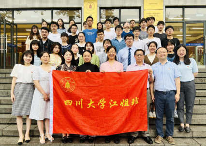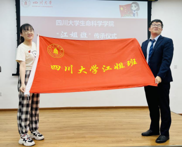 在授旗仪式环节,“江姐班”传承集体2021级强基班班长唐弋航从公司第一届“江姐班”班长李歆睿手中,接过了“tyc5997太阳集团江姐班”的旗帜。他们将以饱满的精神和昂扬的斗志继续“江姐班”的建设,将在川大校园舞台上谱写出充满青春热血与红色精神的全新篇章!