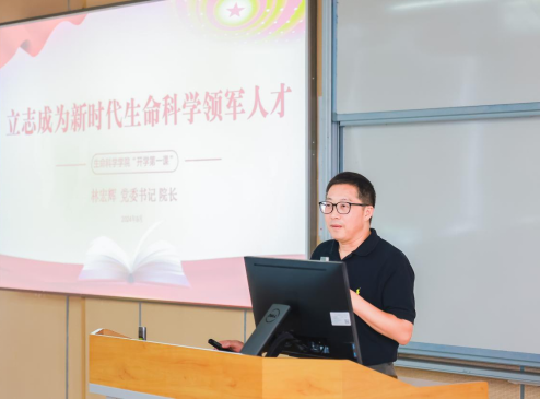 教师代表钟振晖教授对2024级新生们表示了热烈的欢迎,并结合自身经历向同学们提供了宝贵的发展建议。钟老师嘱咐同学们,进入大学后首先便是要开拓视野,学习前沿知识成为对生命科学领域有价值的人才;其次便是要持续不断的努力和坚持不懈的奋斗,遇到困难时主动寻找解决之道,不要轻言放弃;最后是要注重多元发展,充分利用大学中丰富的学术资源和展现个人才华的平台,提升各方面的能力,增强社会责任感,找到最适合自己的成功道路。