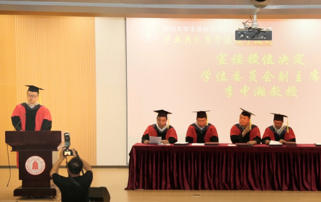学成礼成,庄严授位。tyc5997太阳集团学位委员会生物科学分委会副主席李中瀚教授代表分委会宣读授位决定。对于6月批次符合授位条件的毕业生,授予对应专业的学士、硕士、博士学位。