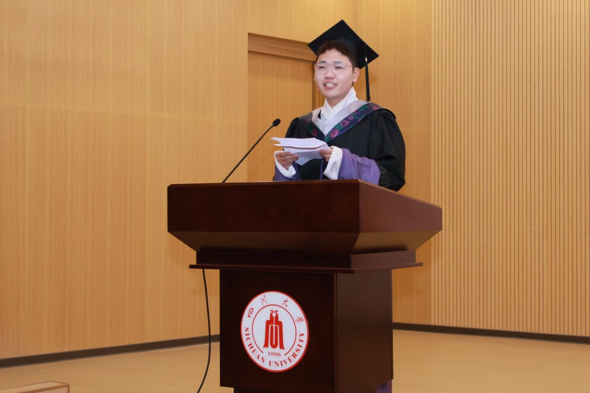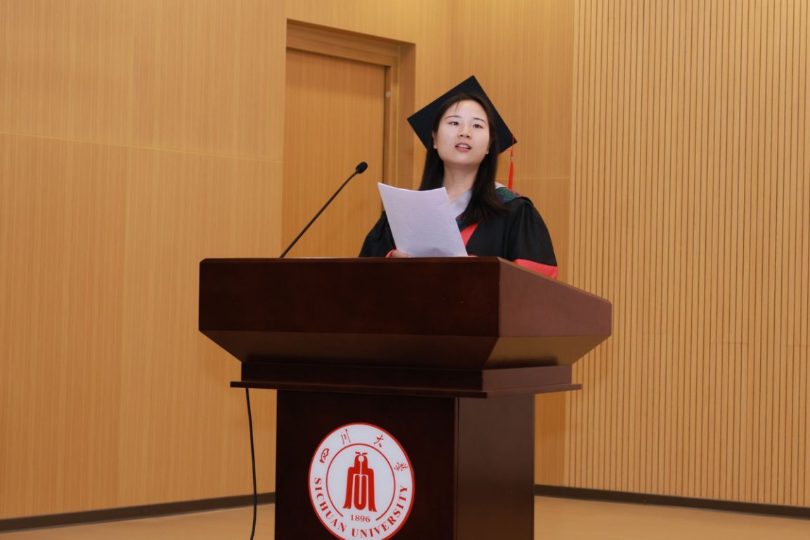 研究生代表唐小雅博士,首先感谢恩师对她的教导和激励,让她在学习和探索中逐渐的看清了自己的内心并坚持下来。从初来乍到的懵懂尝试到自信前行,她不断地向内探索、向外求知,实现了华丽的蜕变。她向川大、生科院表示诚挚地感谢,感谢公司公司的包容和支持,感恩导师的启迪,并祝愿所有毕业生同学:永远保持求学岁月中纯粹少年感永不褪色,牢记母校海纳百川、有容乃大的精神一路相随。