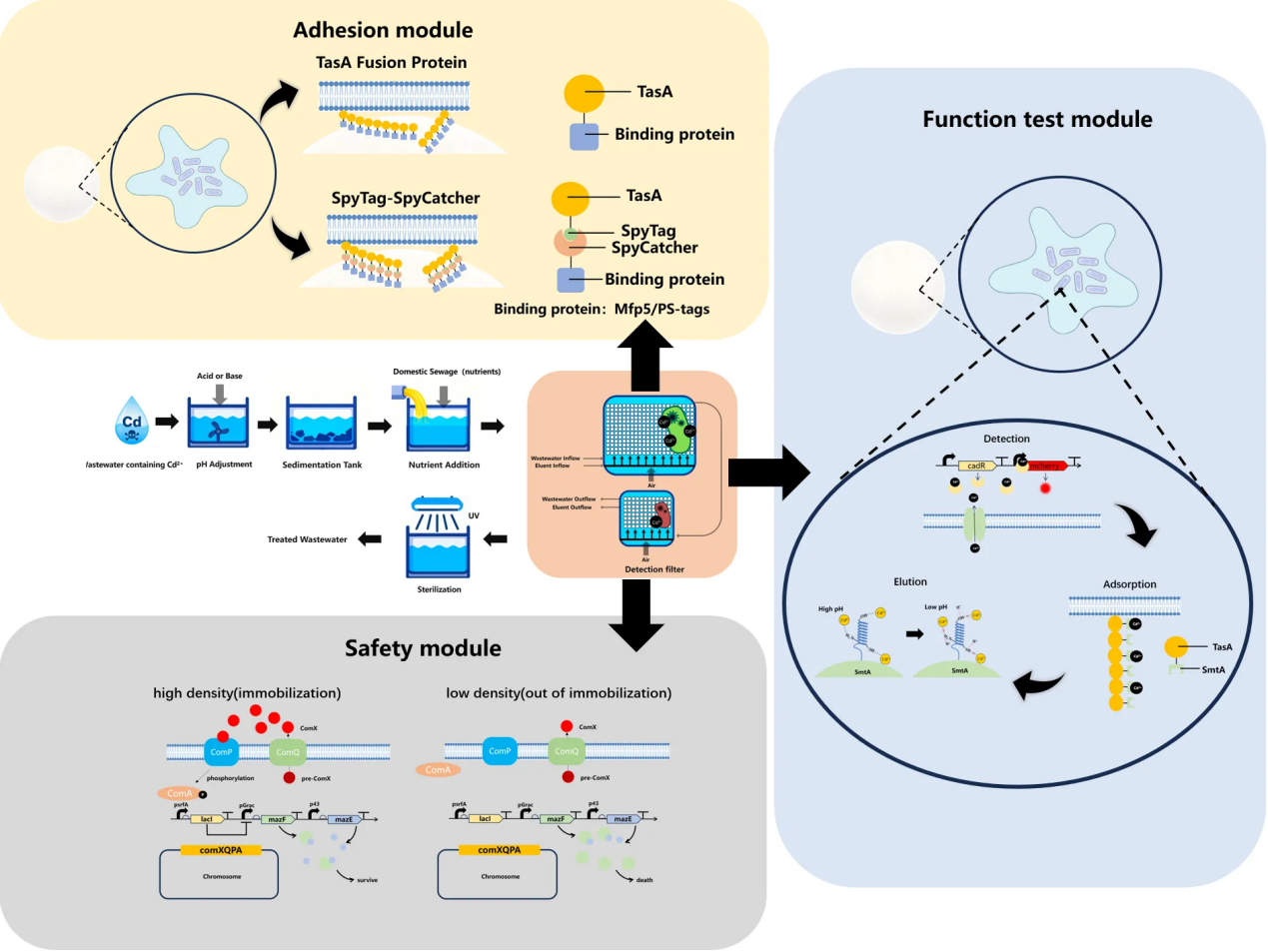 在此基础上,团队进一步将平台升级为一个集镉离子 “感应-吸附-回收” 功能于一体的全流程工作站,实现了对重金属污染水的闭环治理。项目还设计了一套基于群体感应的生物安全防护机制,能有效防止工程菌的环境泄漏,确保了技术的环境友好性与安全性。该平台展现出强大的模块化潜力,未来可通过替换不同的功能蛋白,广泛应用于多种污水处理场景,不仅为合成生物学解决实际环境问题提供了创新性的“川大方案”,更展现了该方案从实验室走向应用的巨大潜力。