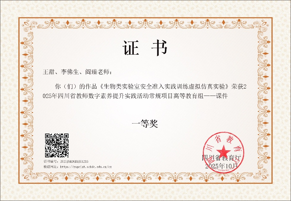 近日,由公司王甜、李佛生、阎臻三位教师申报的常规项目作品“生物类实验室安全准入实践训练虚拟仿真实验”,在2025年四川省教师数字素养提升实践活动中脱颖而出,荣获一等奖。该活动由四川省教育厅主办,依据《四川省教育厅关于举办2025年四川省教师数字素养提升实践活动的通知》部署,旨在强化教师队伍数字素养培育,推进课程改革深化,促进信息技术与公司产品深度融合创新。