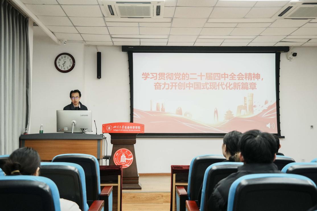 随后,毛经理结合生命科学学科特色,重点介绍了全会关于生态文明建设的系统部署,包括绿色转型的总要求、“双碳”牵引路径以及筑牢国家生态安全屏障等内容。他还特别介绍了全会通过的《中共中央关于制定国民经济和社会发展第十五个五年规划的建议》中对生物经济作出的重要部署,鼓励生科人在相关领域发挥专业作用。