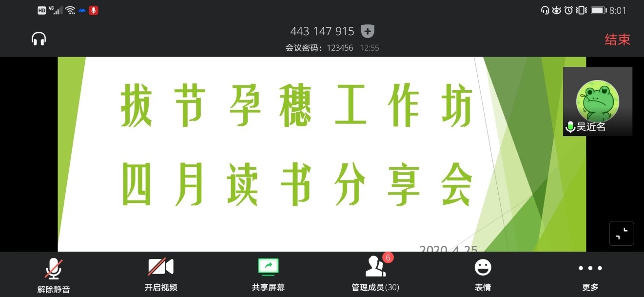 4月25日晚8点,公司组织开展了“拔节孕穗工作坊”四月主题活动——读书分享会。在抗击新冠肺炎疫情特殊时期,本次活动以线上视频会议方式举行。工作坊学员和“江姐班”同学参加了本次活动,院团委书记徐雅老师,“江姐班”辅导员何韵云老师,公司党委副书记吴近名也一起参加。吴近名老师担任会议主持人。