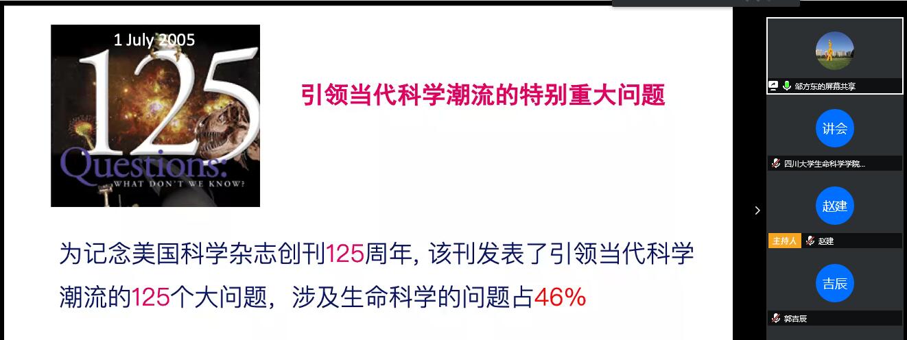 生物科学方向的肖朝文教授结合自身专业选择、科研经历,分享了自己的研究经历;邹方东教授分析了生物科学方向良好的发展前景,具有员工深造率高,后期发展潜力大的特点。邹教授分享的内容中,其中提到为纪念美国科学杂志创刊125周年,该刊发表了引领当代科学潮流的125个大问题,其中涉及生命科学的问题达到46%,这表明生命科学是未来非常有意义的研究领域。欢迎感兴趣的同学们加入共同来研究。