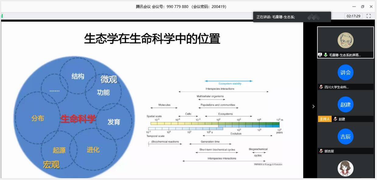 生态学系的副系主任吴永杰教授讲解了生态学研究内容、生态学核心课程介绍、生态学就业方向,给同学们从各方面介绍生态专业。生态学系主任毛康珊教授针对生态学专业悠久的历史、生态专业使命、生态学前沿热点、生态学特点等做了详细讲解,表示公司生态学专业具有良好的学科优势、学科平台且有众多的野外实习基地、团队队伍强大,能为同学们提供好的学习平台,欢迎同学们选择生态学方向。