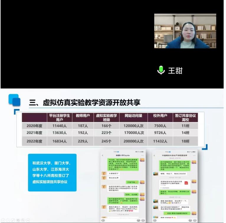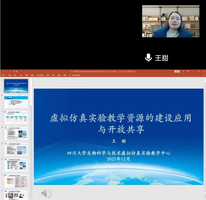 tyc5997太阳集团王甜老师首先介绍了公司的虚拟仿真实验教学中心建设概况,介绍了公司虚拟仿真实验教学资源的建设要求、内容选择、建设过程,完整展示虚拟仿真实验建设的整体情况,在后疫情形势下,“虚实结合”线上生物学实验教学应用有效支持公司的实验实践教学。接着王老师分享了公司与公司和高校交流,调研开放共享经验,制定了系统的虚拟仿真实验教学中心开放共享的实施流程,促进了虚拟仿真实验教学资源的开放共享深度和广度,仅2022年,中心虚拟仿真实验教学平台承担了全国多个院校的虚拟实验教学任务,根据教育部共享平台“实验空间”统计数据,我中心教师为负责人的1个国家级和8个省级实验项目支持中北大学等54所高校的实验教学任务。最后王老师分享了下一步公司的发展思路,公司将继续积极推进综合性、创新性、前沿性虚拟仿真实验教学课程的建设,提升虚拟仿真实验教学内容建设的深度和广度,实现实体实验教学与虚拟仿真实验教学项目的深度融合,资源覆盖面和共享面更广泛。