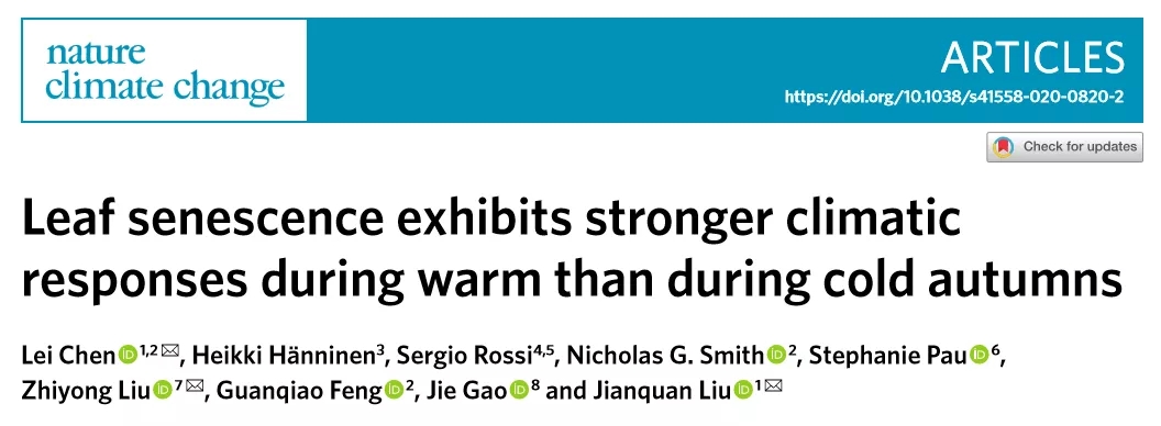 刘建全团队在Nature Climate Change上发文揭示树木叶片衰老响应全球变暖的机制