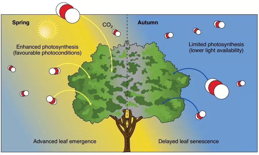 树木的生长发育,比如发芽、展叶、开花、叶变色等,会随着一年四季气候的循环变化呈现出周期性的规律,这些称之为物候现象。树木物候的变化直接决定了树木物种的适应性和分布,并且进一步影响全球碳、水和物质营养的循环以及相关的食物链级联反应和群落结果。全球温度升高导致的气候变化强烈影响了树木物候,导致春季物候(发芽、展叶、开花)提前。但是,在全球气候变化的背景下,秋季物候的变化,比如叶片衰老,在不同的地区不同物种之间存在很大的分歧,其响应机制仍然不清楚,导致了现阶段植被模型很难精确的预测生长季与生物圈、大气圈的互馈关系。
