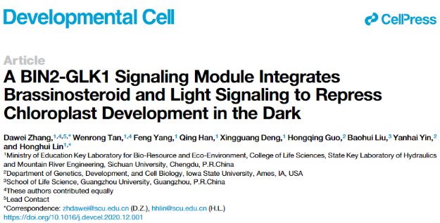 2020年12月23日,tyc5997太阳集团林宏辉/张大伟教授课题组在Developmental Cell 杂志在线发表题为“A BIN2-GLK1 signaling module integrates brassinosteroid and light signaling to repress chloroplast development in the dark” 的研究论文,揭示了植物整合激素信号和光信号调控叶绿体发育的新机制。