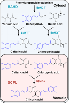 菊苣酸的生物合成涉及了植物中已知的两大家族酰基转移酶BAHD和SCPL。在胞质中,两个BAHD家族成员EpHTT和EpHQT分别催化咖啡酰辅酶A和酒石酸及奎宁酸反应生成咖啡酰酒石酸及绿原酸,两个产物进入液泡中后,被SCPL家族成员EpCAS催化,生成菊苣酸和奎宁酸。已经鉴定功能的SCPL类酰基转移酶主要采用1-O-β-葡萄糖苷作为酰基供体[5],而EpCAS酰基供体变为了绿原酸,这一发现改变了对于SCPL家族酰基转移酶的认知;与此同时,通过与部分已知能够合成菊苣酸的物种比较,研究人员发现这个新鉴定的菊苣酸合成途径是在紫锥菊中特有的,这表明菊苣酸合成途径在不同物种中可能产生了趋同进化。