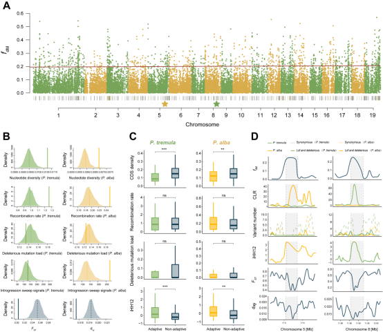 最后,研究人员利用不同方法检测和评估了物种间基因组渐渗程度大小。结果显示种间亲缘关系在基因组不同区域存在着不同权重的拓扑结构(图4A-B),通过D检验和f4检验分析,证明了基因渐渗在杨属不同物种分化过程中广泛存在(图4C)。