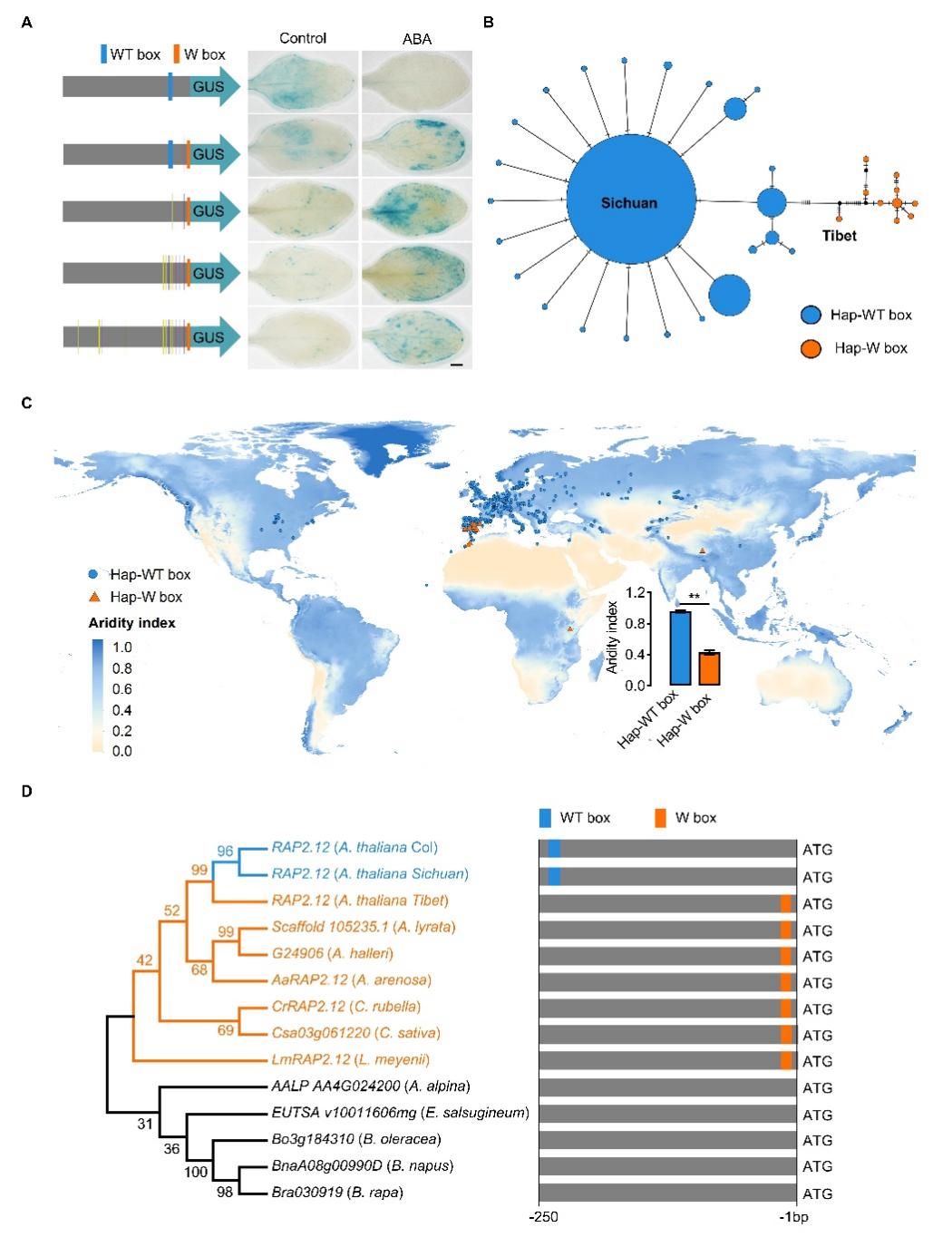 为了探究WT 和W box元件在全球生态型RAP2.12基因中的分布情况,对672个生态型能鉴定该基因的启动子序列进行了检测。他们发现这些生态型该基因启动子均可分为这两种调控元件类型;W box单倍型零散地分布于青藏高原、干旱的欧洲西南部和非洲,而其余分布于湿润地区的拟南芥生态型都具有WT box单倍型(图4)。最后,还检查了十字花科拟南芥属近缘类群的RAP2.12基因调控区改元件的组成,发现都是W box,因而抗旱的该单倍型启动子更为古老,而WT box单倍型以及该基因抗水淹是拟南芥后期扩散到湿润地区才起源和功能转换的(图4)。