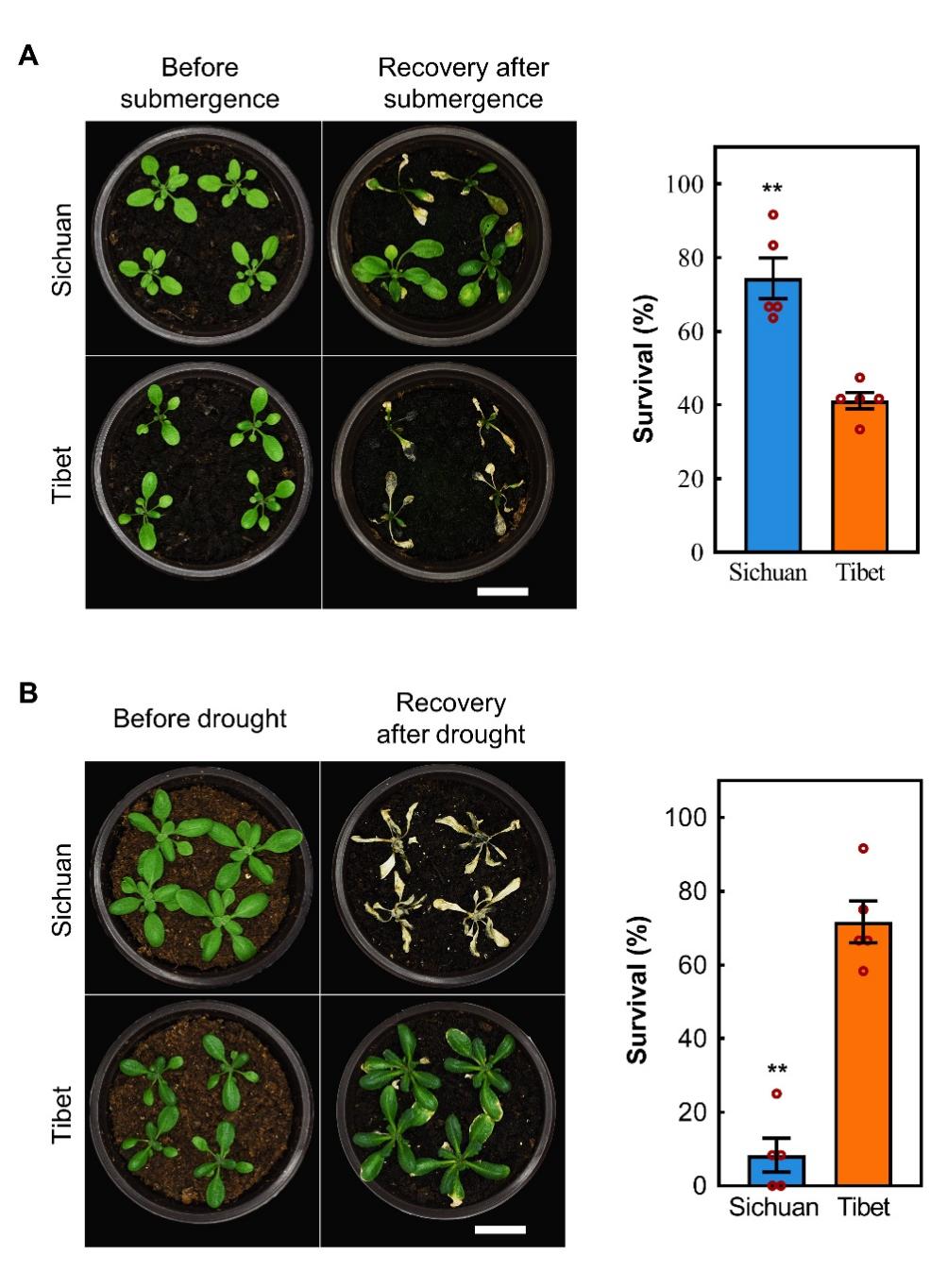 水是影响植物生存和分布的重要环境因子,环境中可利用水低于植物所需的耐受下限,或环境中水分含量超过植物所能承受的耐受上限,都会限制植物的存活和分布。植物对环境水的耐受下限通常采用干旱实验进行检验,而环境中水分过多则易导致植物地下甚至地上部分遭受水淹引起的低氧胁迫,可通过水淹或模拟水淹引起的低氧响应实验进行评估。为了探究拟南芥如何适应这两个相反的生态环境胁迫,刘建全研究团队首先对拟南芥西藏生态型和四川生态型的旱涝分化进行了鉴定;发现两个生态型之间的旱涝适应分化非常显著(图2):西藏生态型抗干旱,四川生态型抗水淹。