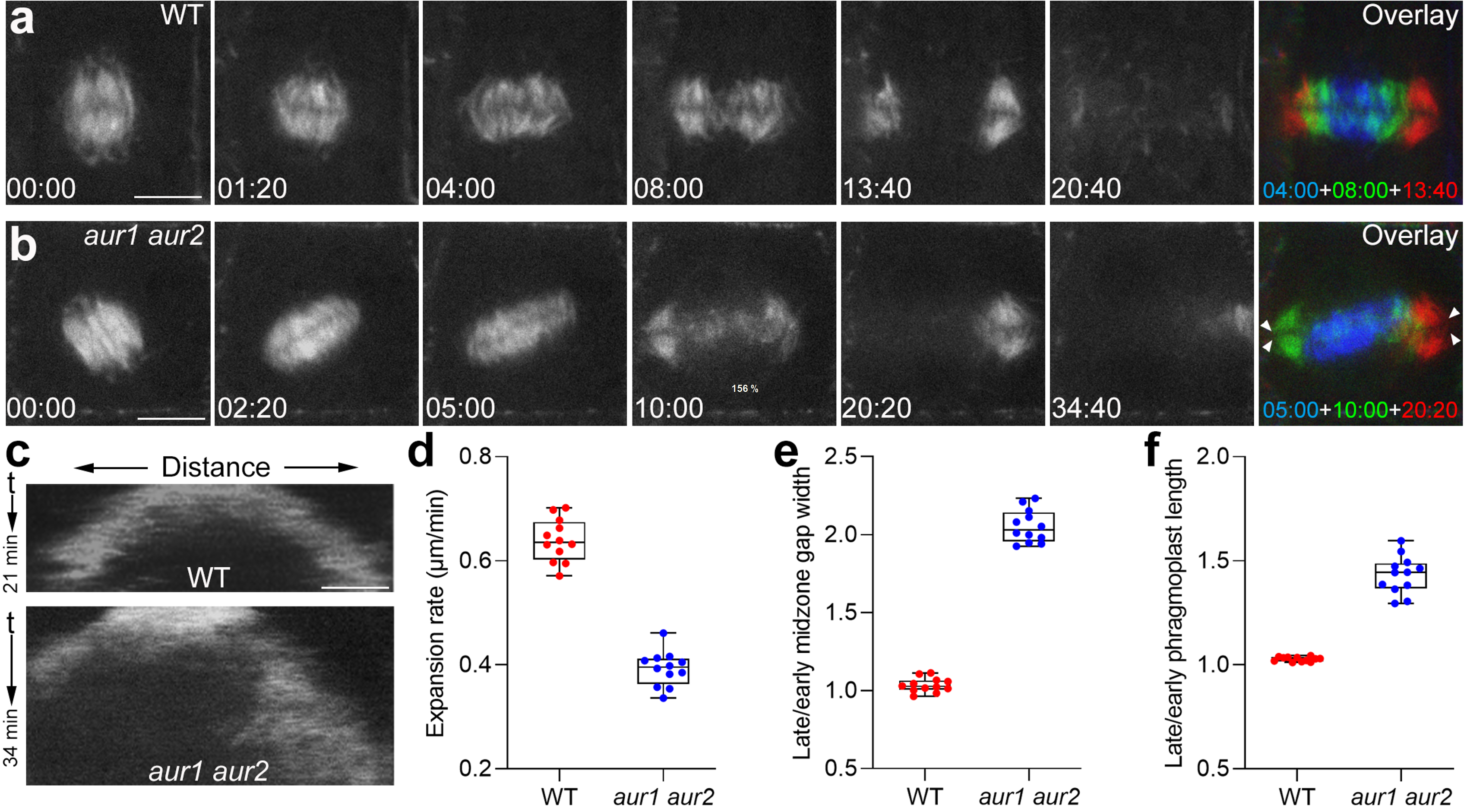 Aurora激酶家族因其在纺锤体两极的特殊定位而得名“极光”,α-Aurora是植物有丝分裂的核心调控因子,其对纺锤体微管阵列的组装十分重要。该研究发现随着胞质分裂的开始,α-Aurora会从纺锤体微管的两级转移并集中定位于成膜体微管中央区域。α-Aurora缺陷会导致成膜体扩展速度降低,胞质分裂过程延长,并且在胞质分裂后期成膜体微管阵列变得松散。