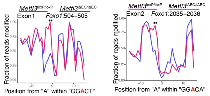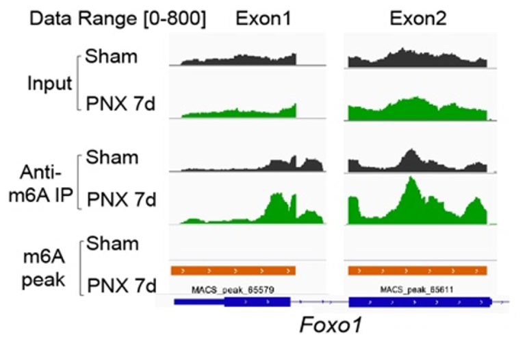 m6A修饰是真核生物中常见的mRNA修饰,对细胞行使功能起到了重要的作用。其参与涉及 mRNA 生命周期中诸多方面的调节,包括前体 mRNA 剪接,mRNA 出核,mRNA稳定性和翻译过程。m6A修饰是由甲基化酶(Writer)和去甲基化酶(Eraser)参与的动态可逆的调控过程,甲基化酶主要包括METTL3、METTL14和WTAP等,去甲基化酶主要包括ALKBH5和FTO等。本研究中,首先在肺再生模型中(Pneumonectomy,PNX),筛选出显著上调的m6A甲基酶METTL3,构建内皮细胞特异性敲除Mettl3(Mettl3i∆EC/i∆EC)小鼠,发现在肺再生过程中内皮细胞Mettl3缺失,会导致套叠式血管异常增多,胶原纤维沉积,小鼠肺功能下降,以及促纤维化因子上调。为了深入探索内皮细胞中METTL3调控肺再生的机制,通过联合应用MeRIP测序技术与纳米孔三代测序技术,发现METTL3通过调控 Foxo1 mRNA的m6A修饰位点进而维持套叠式血管的生成以及促再生的内皮糖酵解。