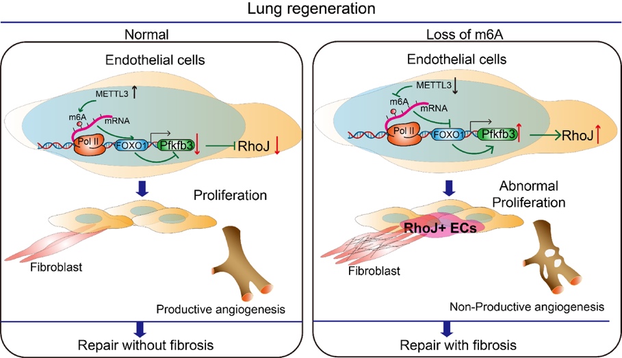 在肺再生模型中,通过对Mettl3iΔEC/iΔEC 和 Foxo1iΔEC/iΔEC小鼠进行单细胞测序,发现抑制Mettl3-Foxo1信号,刺激了高增殖高糖酵解的Pfkfb3+RhoJ+内皮细胞亚群的生成,并在博来霉素诱导的肺纤维化模型中,靶向Rhoj,发现可以缓解胶原沉积,减少套叠式血管生成,减轻纤维化。