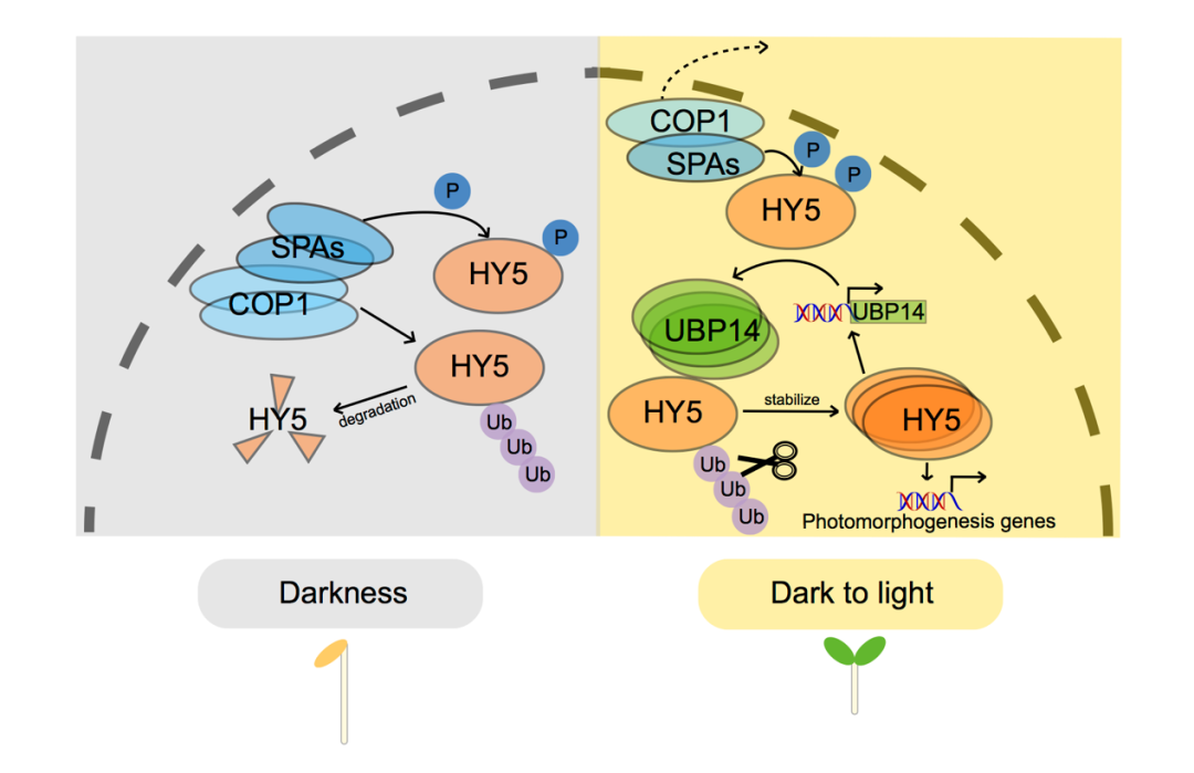 该研究首先发现去泛素化酶UBP14可以在体外和体内直接与HY5相互作用。UBP14能够从泛素化的HY5上去除泛素,从而增强HY5的稳定性。缺失UBP14去泛素化功能的突变体da3-1表现出较长的下胚轴,而过表达UBP14的转基因植株和过表达HY5的转基因植株的下胚轴表型类似。在光照下,HY5蛋白快速积累,UBP14功能缺失导致HY5积累变慢。之前的研究发现与磷酸化的 HY5 相比,未磷酸化的 HY5 在结合下游基因和调节基因表达方面更具活性。该研究揭示了UBP14倾向于在光照下稳定非磷酸化的HY5,以促进光形态建成。另外,在光下HY5促进UBP14的基因表达和蛋白积累。