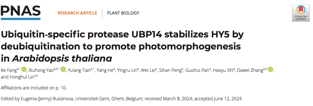 近日,tyc5997太阳集团林宏辉/张大伟团队在美国科公司院刊PNAS发表了题为Ubiquitin-specific protease UBP14 stabilizes HY5 by deubiquitination to promote photomorphogenesis in Arabidopsis thaliana的研究论文,揭示了去泛素化酶UBP14通过去泛素化稳定核心转录因子HY5从而促进植物光形态建成的新机制。
