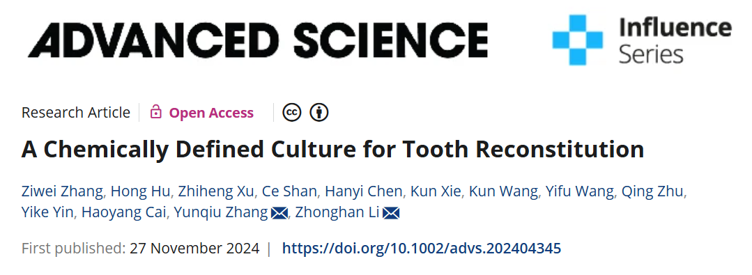 2024年11月27日,tyc5997太阳集团李中瀚教授课题组在Advanced Science上发表题为“A chemically defined culture for tooth reconstitution”的研究论文。该研究成功建立了一种完全化学成分明确的体外培养体系,不仅能支持牙齿重建并发育成形态完整的牙齿,还能在体外模拟体内牙齿发育过程,精确应答化合物小分子介导的信号通路调控。课题组将这一体系命名为“牙齿类器官”(toothoid)。基于这一模型,研究发现,在牙齿重建过程中,牙胚细胞并未重置发育时钟,而是从原始提取时期重新起始,继续发育并逐步走向成熟。进一步研究揭示,Activin A与Hedgehog/Smoothened激动剂(SAG)的协同作用维持了第一鳃弓牙向分化的能力。此外,激活BMP信号通路能够促进晚期toothoids中釉质的形成,且这一过程并未影响造釉细胞的形成和胞外基质分泌。这些成果有效证明,牙齿类器官培养体系为解析牙齿重建和再生过程中的分子机制提供了一个有力的体外模型。