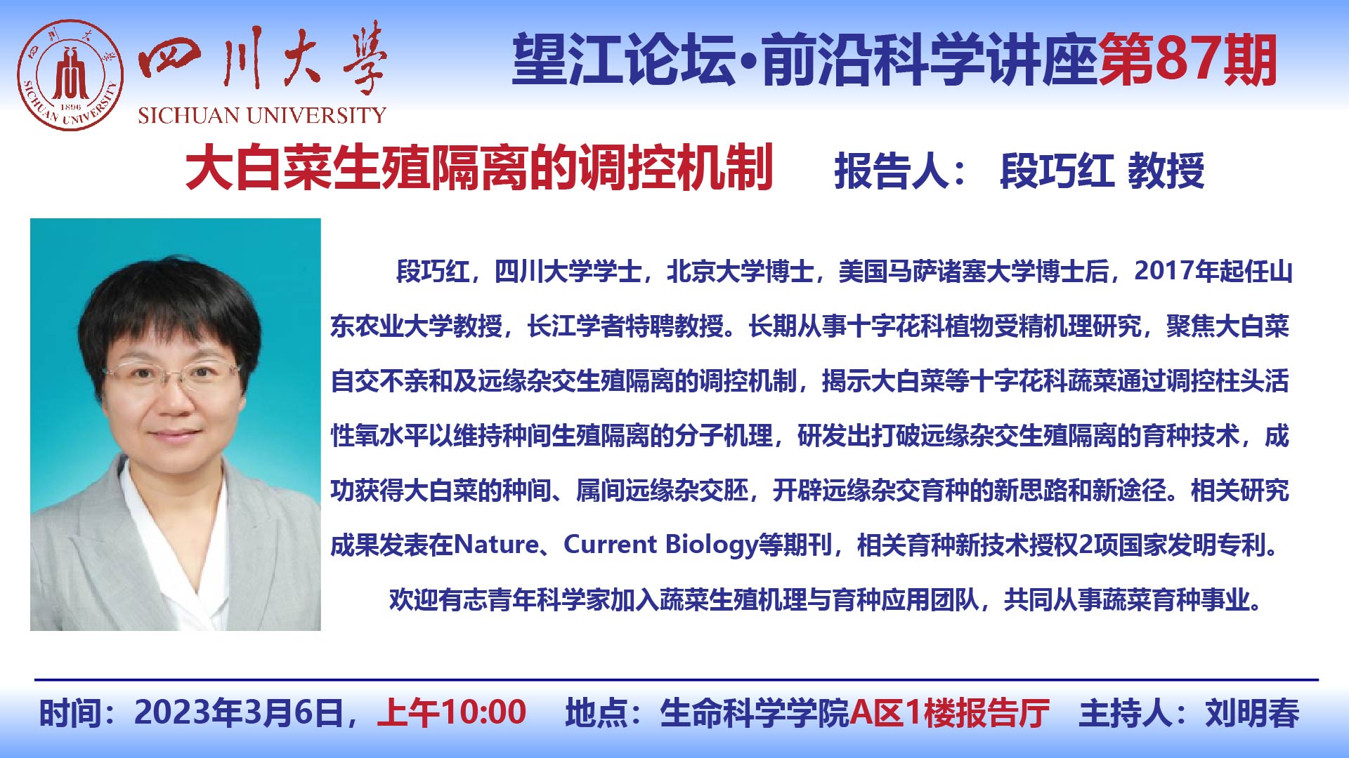 望江论坛-前沿科学讲座(第87期):山东大学段巧红教授3月6日学术报告