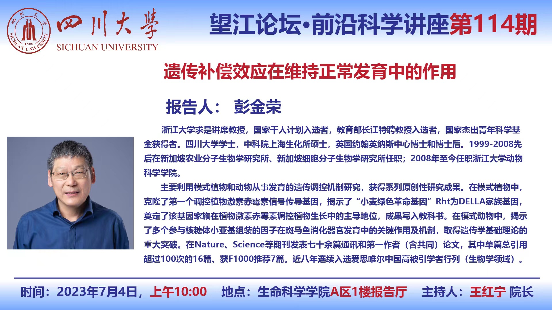 望江论坛-前沿科学讲座(第114期):彭金荣教授7月4日学术报告