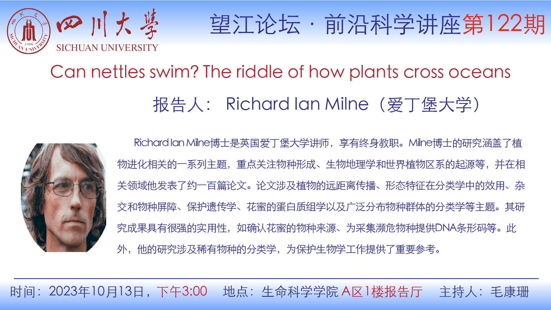 望江论坛-前沿科学讲座(第122期):Richard Milne博士10月13日学术报告
