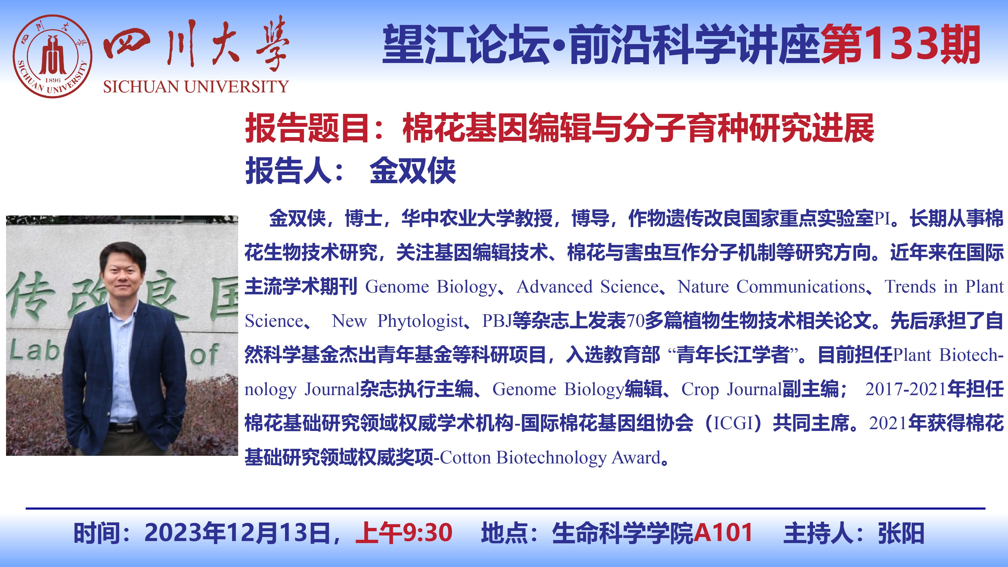 望江论坛-前沿科学讲座第(133期):金双侠教授12月13日学术讲座
