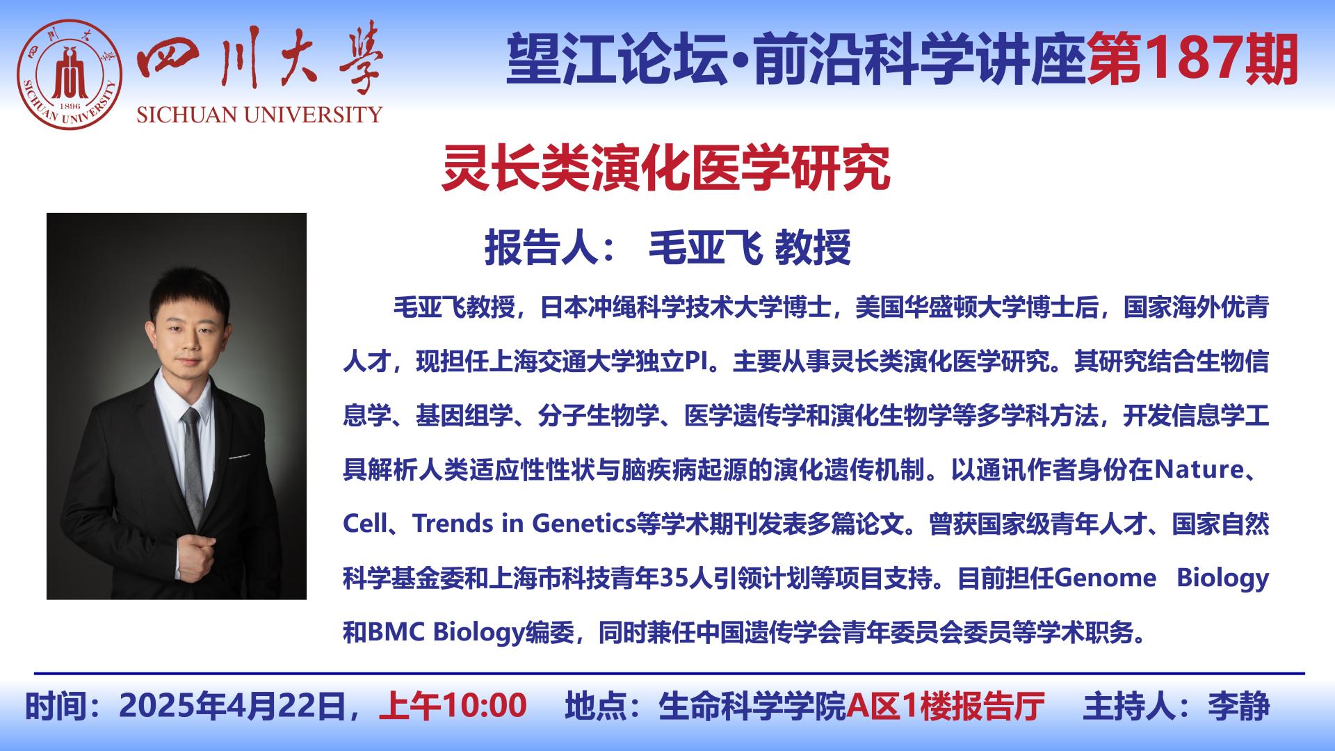 望江论坛-前沿科学讲座(第187期):毛亚飞教授4月22日学术讲座