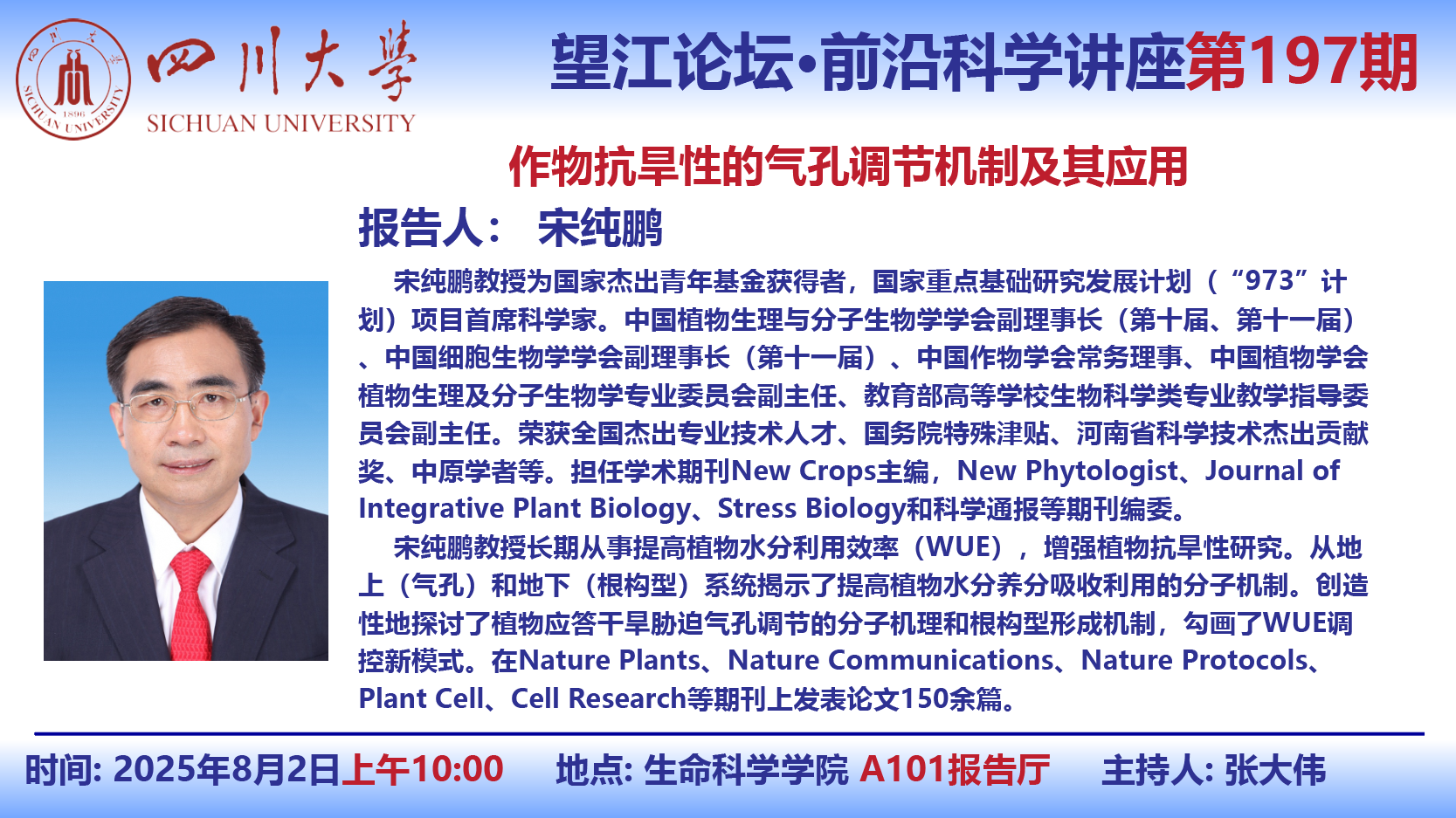 望江论坛-前沿科学讲座(第197期):宋纯鹏教授8月2日学术讲座