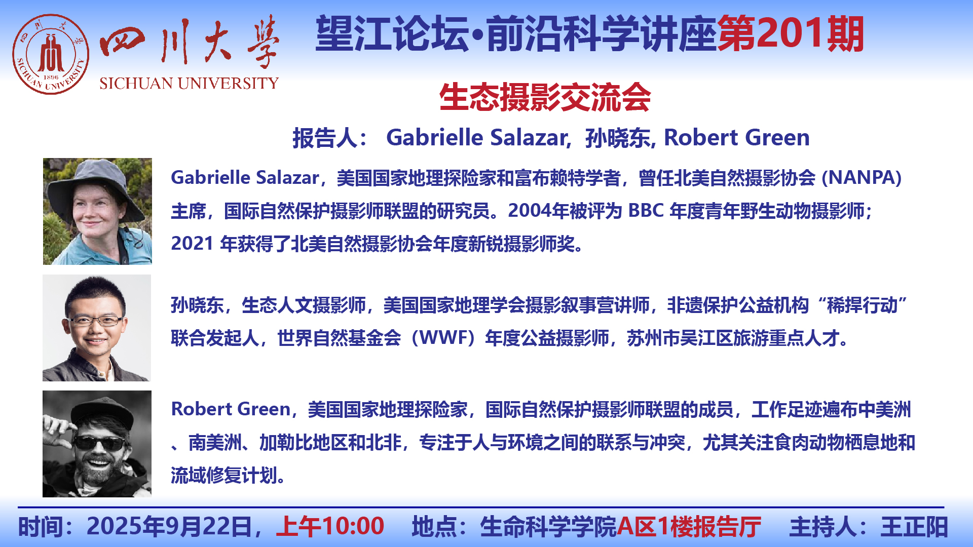 望江论坛-前沿科学讲座(第201期):Gabrielle Salazar,孙晓东,Robert Green 9月22日学术讲座