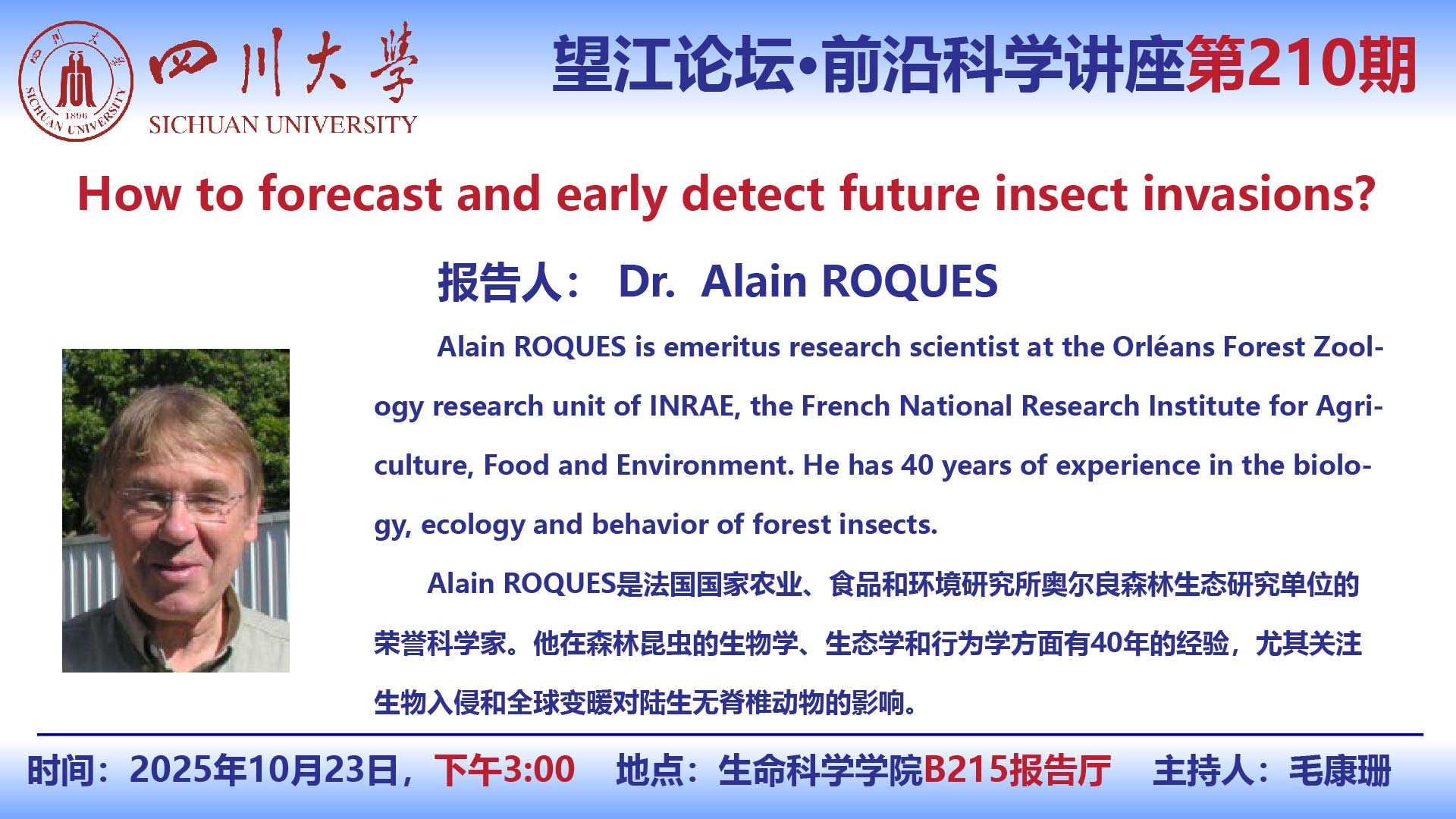 望江论坛-前沿科学讲座(第210期):Alain ROQUES博士10月23日学术讲座