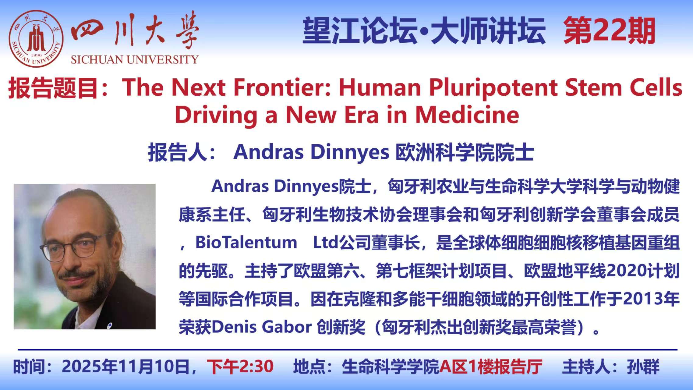 望江论坛-大师讲坛(第22期):Andras Dinnyes院士11月10日学术讲座