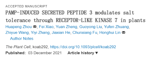 近日,公司植物生理与分子生物学研究室林宏辉/周华鹏课题组在植物学国际权威期刊Plant Cell(IF = 11.277)发表题为“PAMP-INDUCED SECRETED PEPTIDE3 modulates salt tolerance through RECEPTOR-LIKE KINASE7 in plants”的研究论文(DOI: 10.1093/plcell/koab292),阐明了一条新的植物应答与耐受盐胁迫的信号通路,拓展了人们对植物耐盐机制的认识,将有助于耐盐种质资源的创制。该研究发现,拟南芥PAMP-INDUCED SECRETED PEPTIDE3(PIP3)小肽可受盐胁迫显著诱导,其过量表达株系对盐胁迫耐受而功能缺失突变体则对盐胁迫呈现敏感表型。PIP3可分泌至细胞外,并与类受体激酶RECEPTOR-LIKE KINASE7 (RLK7)的胞外结构域相互作用。分析表明,RLK7参与调节植物的耐盐性,其激酶活性可受盐胁迫诱导。PIP3小肽参与调节盐胁迫介导的RLK7激活过程,而PIP3介导的植物耐盐性则依赖于RLK7的作用。进一步研究发现,MPK3/6位于PIP3-RLK7模块的下游,后者对盐胁迫条件下MPK3/6的激活是必需的。MPK3/6参与放大了PIP3-RLK7模块介导的植物耐盐信号,并启动下游信号调控网络,从而提高植物的耐盐能力。上述研究报道了一条全新的植物耐盐信号通路,为进一步理解植物的耐盐性提供了新的证据,将有助于耐盐种质资源的创制。