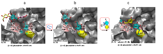 研究结果显示糖基转移酶OsUGT91C1在甜菊糖苷糖基化过程中表现出少见的反应多样性特征。虽然它能等效地在甜菊糖苷C13-羟基(R1)和C19-羧基(R2)两个方向催化形成β (1-2)糖苷键(图2a),比甜叶菊自身的糖基转移酶更为高效地参与生物合成甜菊糖苷D和M;但OsUGT91C1同时也会催化糖基化副反应,即催化在甜菊糖苷C13-羟基方向形成β (1-6)糖苷键,给目标产物甜菊糖苷D和M带来杂质和不利影响(图2b)。一般说来,当酶显示出催化反应的多样性,即底物识别模式存在可变性和一定自由度,很难获得匹配各种反应的直接结构信息。课题组解析了OsUGT91C1和一系列甜菊糖苷底物分子的复合物晶体结构,展现了在催化过程中,甜菊糖苷底物可自由翻滚,发生分子的横向旋转及糖基基团的纵向翻转,从而将不同位置的反应基团递送到同一催化位点,直观揭示了匹配OsUGT91C1不同方向,不同形式糖基化反应的底物识别模式,及其相互转换关系(图3),阐明了OsUGT91C1催化多样化糖基转移反应机理的结构基础。