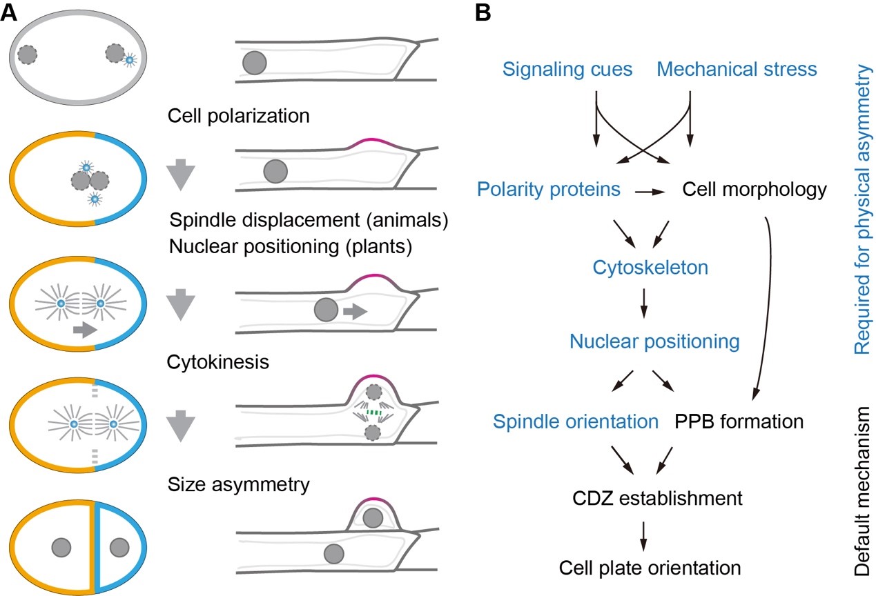 细胞多样性是组织和器官形成的前提。在发育过程中,细胞通过不对称分裂产生形态、大小和命运不同的子细胞。这一过程与分裂位置的确定密切相关。动物不对称分裂位置的决定由保守的“极性蛋白-细胞骨架-纺缍体定位”机制介导。该通路的多种组分在植物细胞中普遍缺失。此外,植物细胞具有细胞壁,其分裂过程由植物特有的早前期带(preprophase band)和成膜体(phragmoplast)完成。因此,长期以来,植物细胞不对称分裂被认为采用了与动物细胞不同的机制。现有的研究表明植物通过特有的极性蛋白调控不对称分裂。然而,植物中是否存在广泛保守的分子通路尚不清楚。