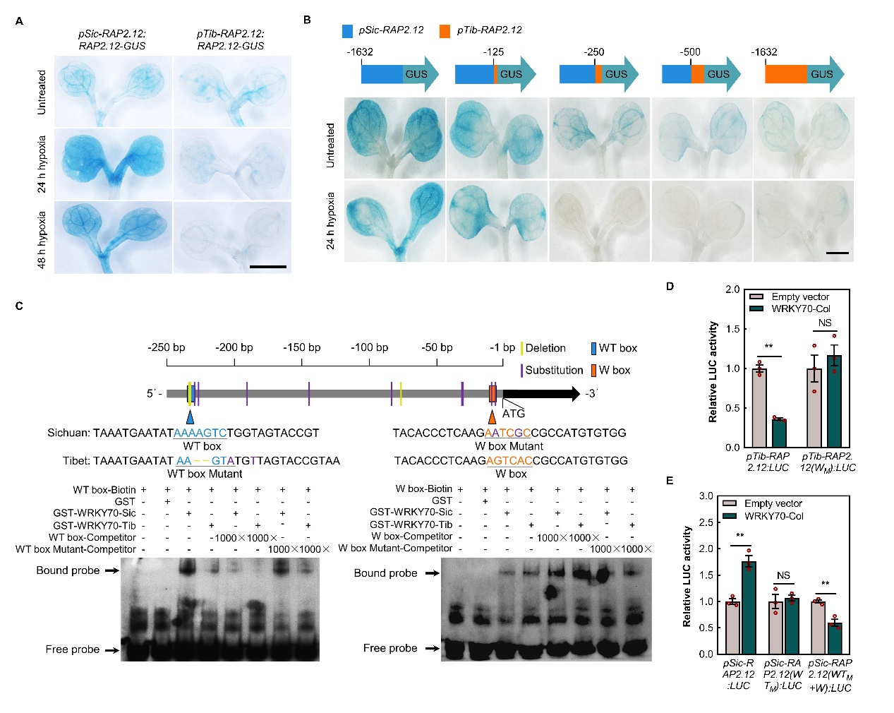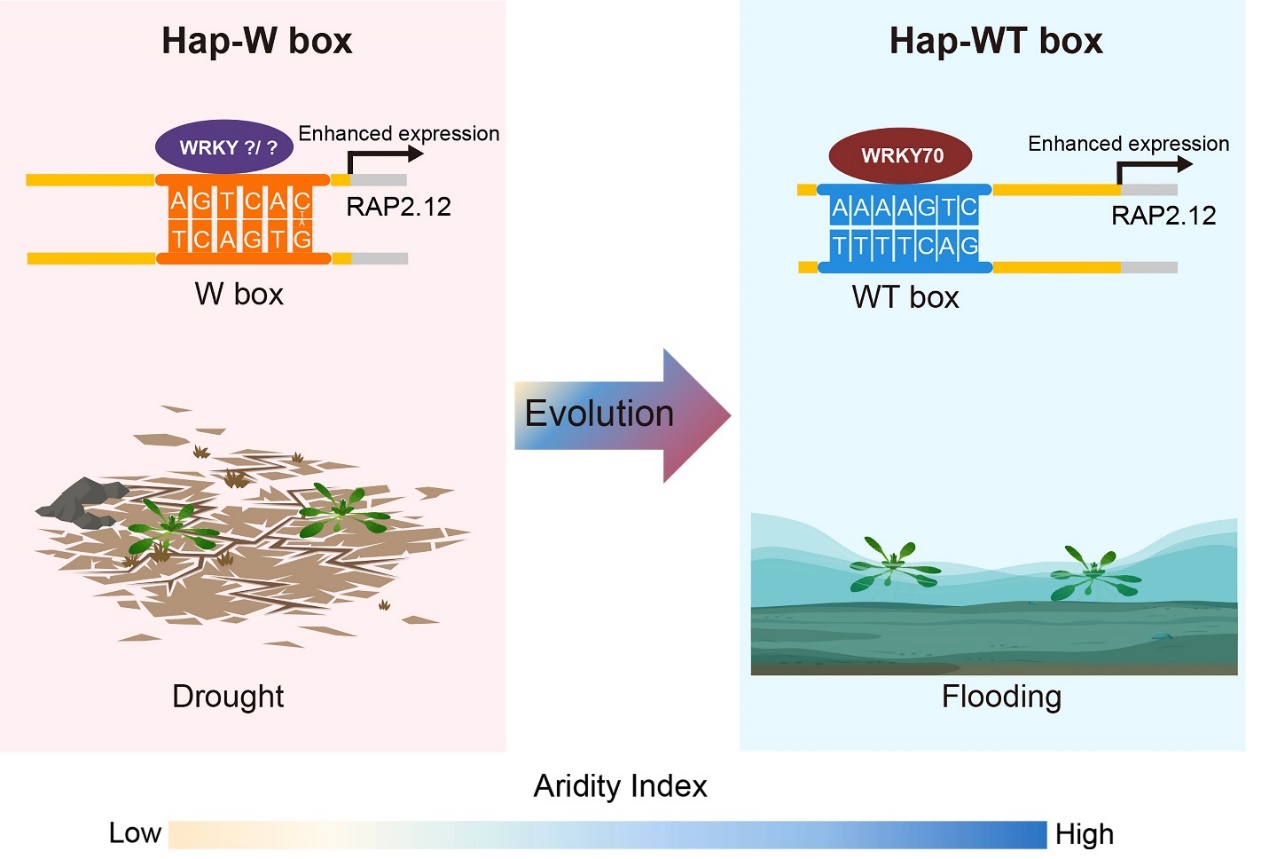 然后,研究人员通过这两个代表生态型构建的重组自交系群体和图位克隆群体筛选到一个旱涝适应转变的关键候选基因RAP2.12。进而对该基因在两种生态型抗干旱和水淹过程中的表达进行检测发现:干旱过程中,西藏生态型的该基因高表达从而促进其抗干旱;水淹过程中,四川生态型的该基因高表达促进抗水淹胁迫;但是每种生态型的该基因在与其原生生境不吻合的胁迫下,都不受诱导高表达。比较两个生态型RAP2.12氨基酸等位变异发现,仅有的一个氨基酸变异没有导致其表达分化或功能分化。但是,两个生态型RAP2.12启动子中核心顺式元件存在显著分化,分别形成WT 和W box元件,结合完全不同的转录调控因子,由不同转录因子响应相反的环境胁迫,诱导该基因在不同生态型的不同环境高表达(图3)。