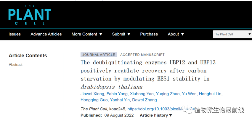2022年8月9日,The Plant Cell在线发表了tyc5997太阳集团张大伟教授团队题为“The deubiquitinating enzymes UBP12 and UBP13 positively regulate recovery after carbon starvation by modulating BES1 stability in Arabidopsis thaliana”的研究论文。该研究揭示了植物如何通过去泛素化酶UBP12和UBP13调控BES1蛋白丰度,在碳饥饿后的恢复阶段增强BR调控的生长,从而使植物快速恢复。