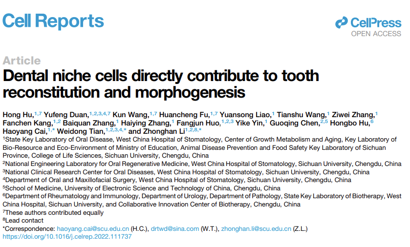 Cell Reports| 重点实验室李中瀚教授、田卫东教授、蔡浩洋教授团队发现牙龛细胞直接参与牙齿重建和形态发生