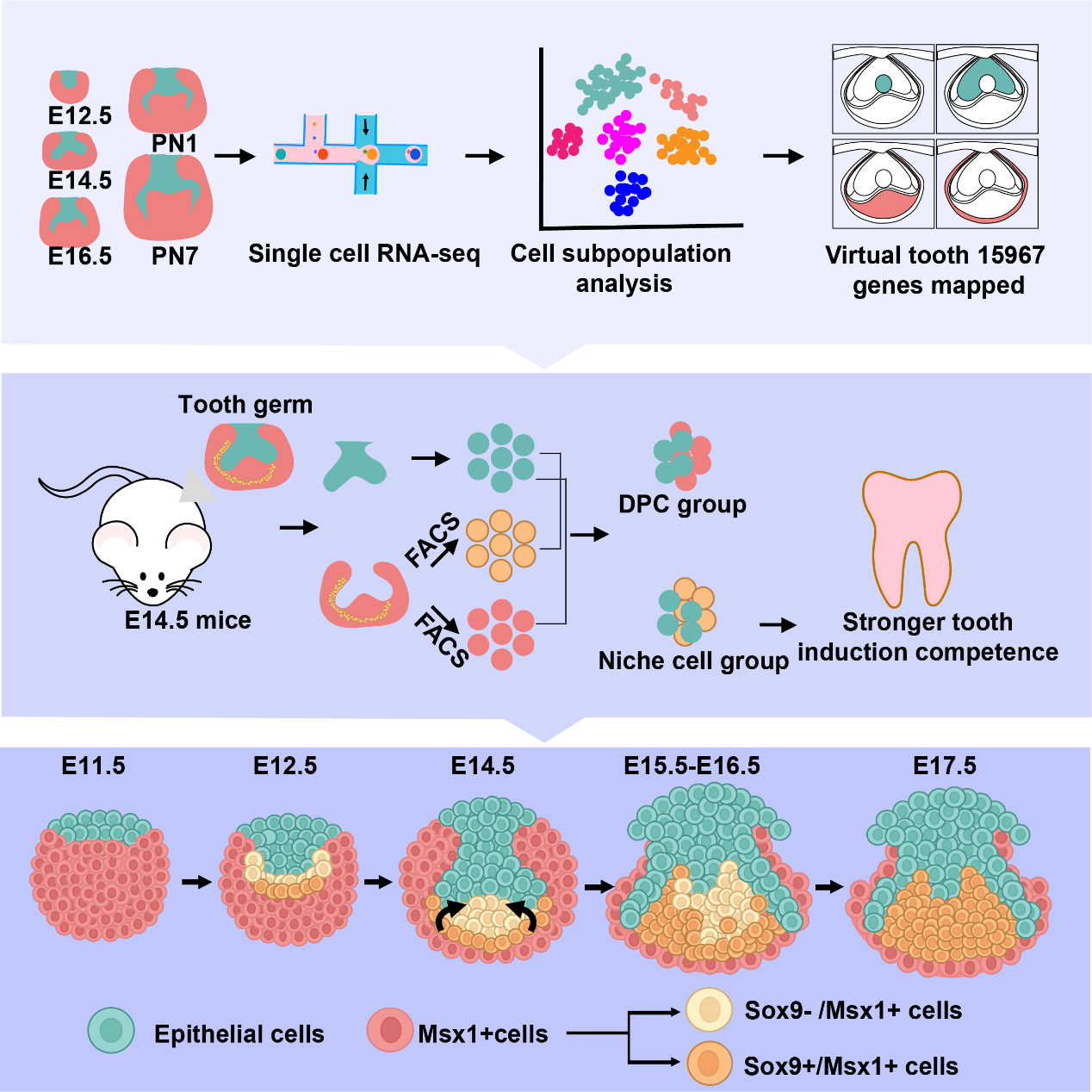 2022年12月6日,tyc5997太阳集团李中瀚教授、田卫东教授、蔡浩洋教授的研究团队在Cell Reports上发表题为“Dental niche cells directly contribute to tooth reconstitution and morphogenesis”的研究论文。该研究通过单细胞测序,利用生物信息学技术,表征了从胚胎到出生后阶段(E12.5到PN7)磨牙发育过程中上皮细胞和间充质细胞的细胞动态变化,并结合DistMap方法高精度表征了在E14.5磨牙表达的基因位置。其中Sdc1被鉴定为牙乳头的特异性标记,而牙龛细胞表达其他特征基因。令人惊讶的是,体外牙胚重建和体内肾被膜移植结果显示牙龛细胞表现出比Msx1+Sdc1+牙乳头更强的牙齿诱导能力,并形成了成簇的牙齿,同时也表明Msx1+Sdc1+牙乳头细胞可以直接从牙上皮和牙齿牙龛细胞之间的相互作用中再生。在此基础上,研究人员进一步从牙龛细胞中鉴定了一组以前未被鉴定的Msx1+Sox9+细胞可能是牙乳头的细胞起源,在发育过程中迁移并取代了原始的牙原基。综合上述,该研究表结果表明牙龛细胞直接参与了牙齿的器官发育,可以为进一步开发牙齿生物工程重建新技术提供重要理论支撑。