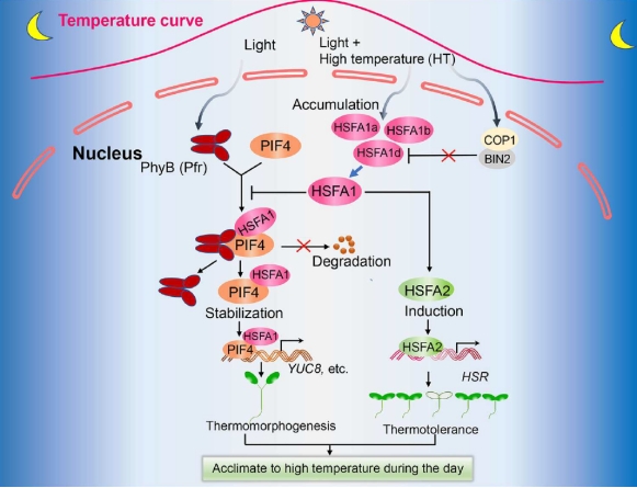 Science Advances:重点实验室张大伟团队与西南科技大学合作揭示HSFA1整合光温信号调节植物热形态建成的分子机制
