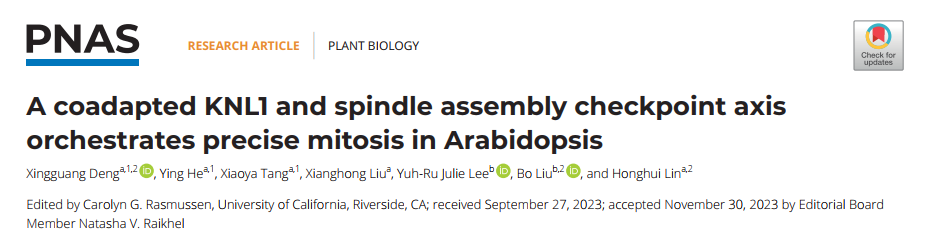 近日,tyc5997太阳集团林宏辉/邓星光团队与美国加州大学戴维斯分校柳波团队合作在PNAS发表了题为“A coadapted KNL1 and spindle assembly checkpoint axis orchestrates precise mitosis in Arabidopsis”的研究论文。该论文解析了动粒蛋白KNL1和纺锤体组装检查点信号分子之间的快速进化和谱系特异性联系。